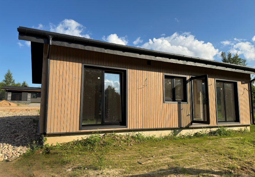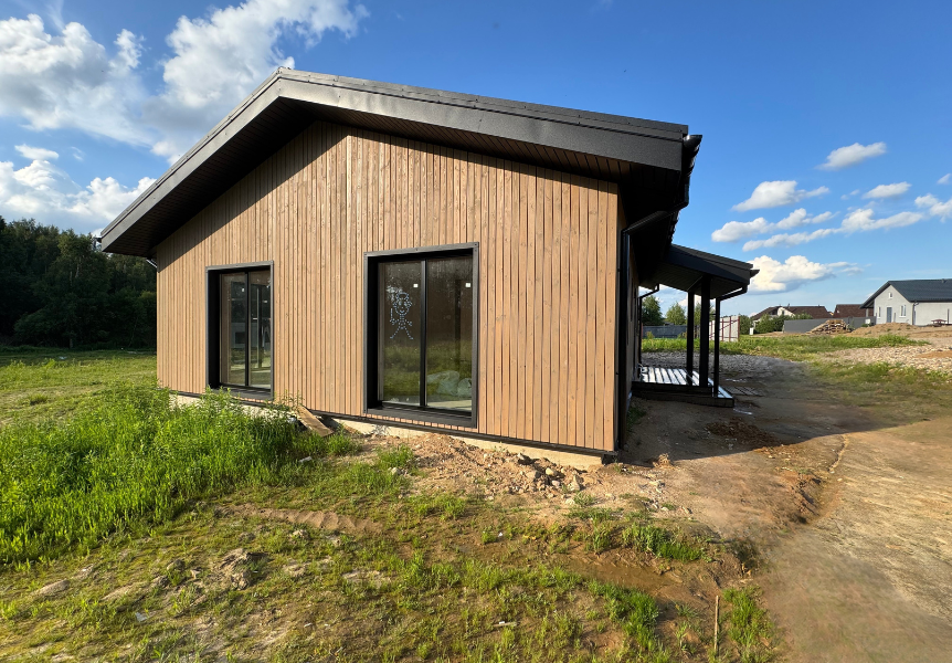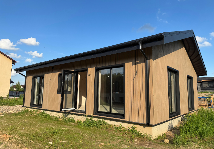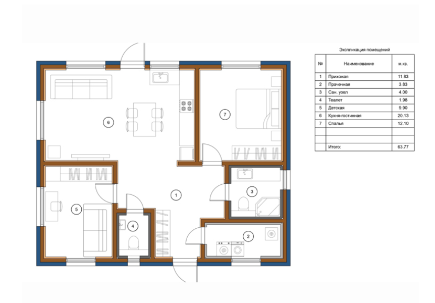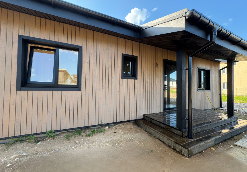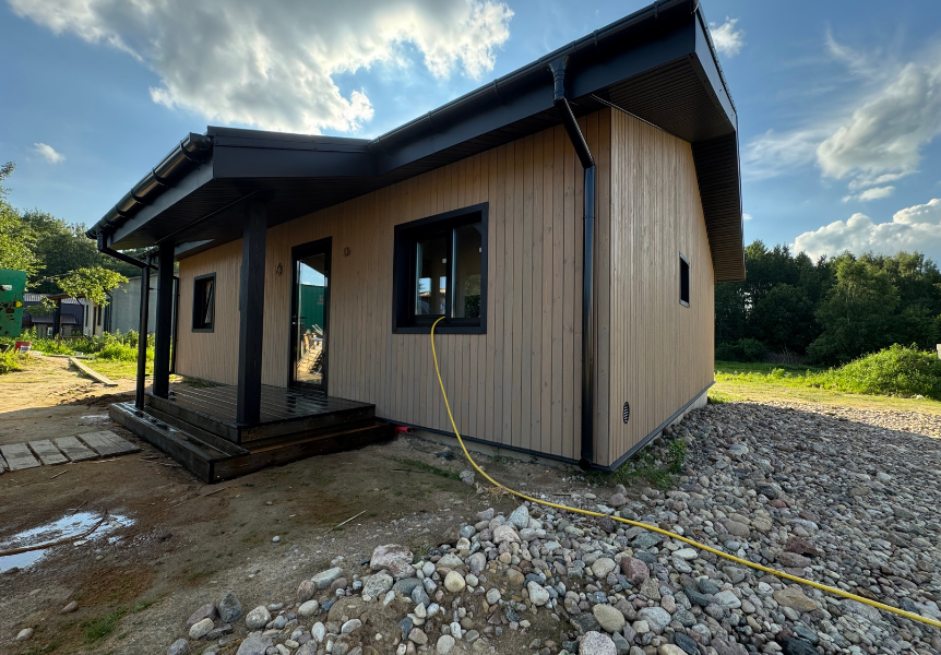 Сдержанность и элегантность дома «Классик-3» несомненно придётся по вкусу многим. Помимо внешней эстетичности, данной дом отличается ещё и максимально удобной планировкой. В нём есть просторная кухня-гостиная, спальня, прачечная, туалет, санузел и прихожая. Главным плюсом является наличие небольшого крылечка, которое поможет сохранить чистоту в доме.