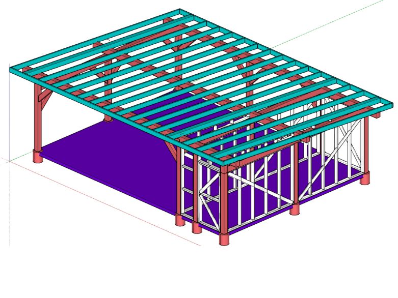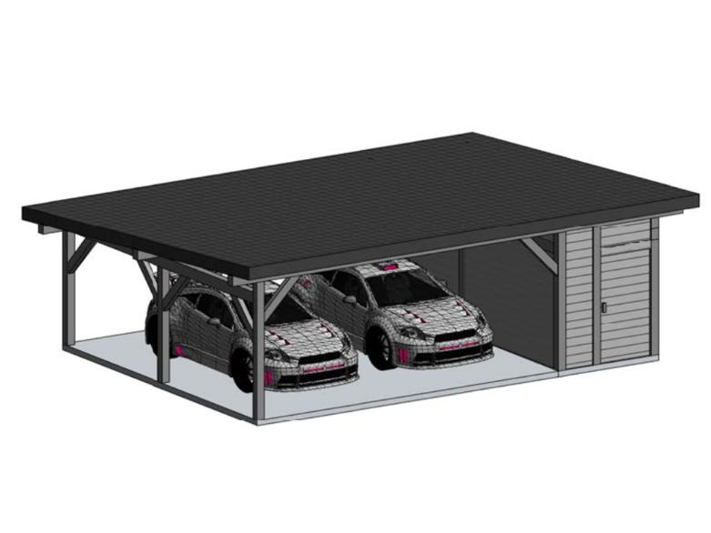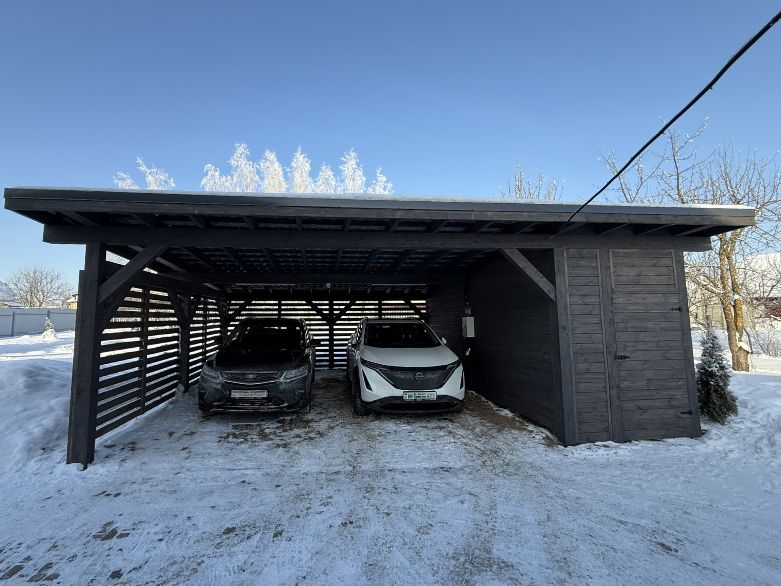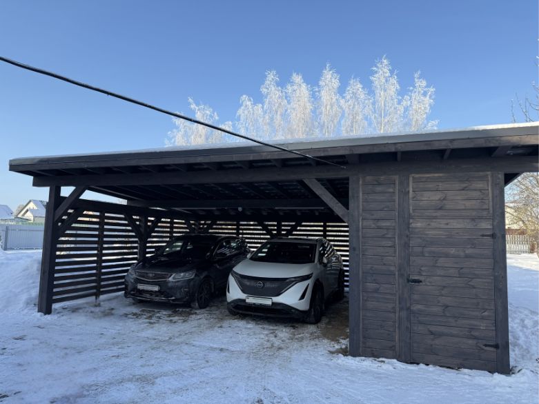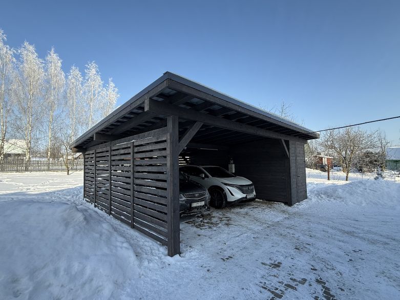 Особенность данного строения заключается в том, что оно объединяет в себе автонавес и хозблок, которые имеют односкатные крыши и в целом выполнены в едином стиле. Конструкция имеет глубину по сваям 6 метров и общую ширину 9 метров, из которых 3 метра отведено под хозблок.