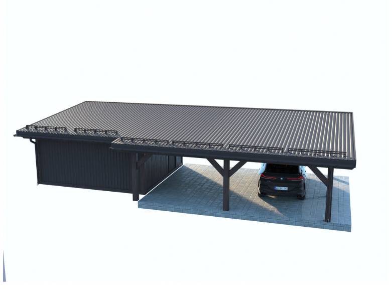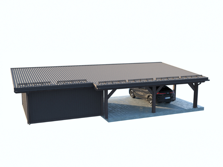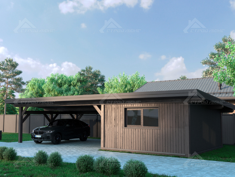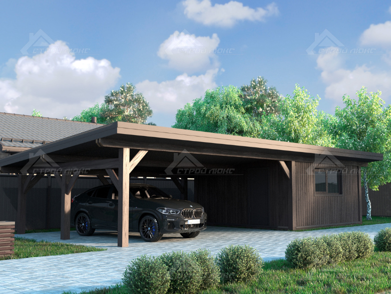 Этот проект сочетает в себе функциональность и надежность. Он предназначен не только для защиты двух ваших автомобилей от солнца, дождя и снега, но и предоставляет дополнительное полезное пространство в виде утепленного хозяйственного блока. Это идеальная постройка для порядка на участке и комфорта для вашей техники.