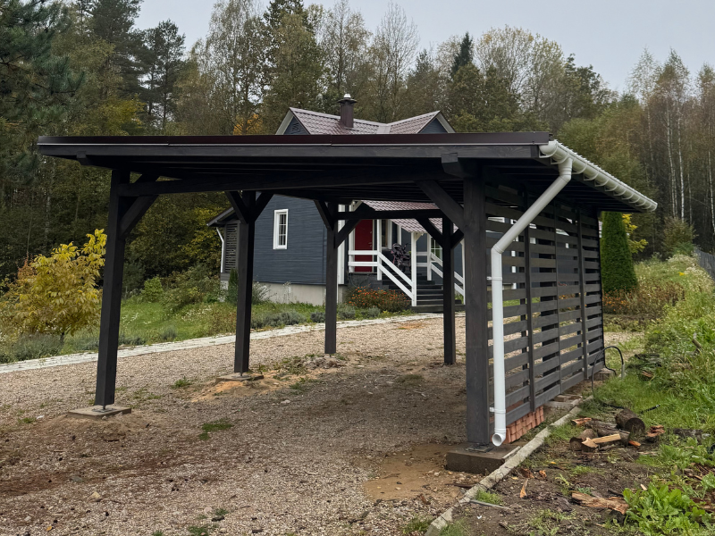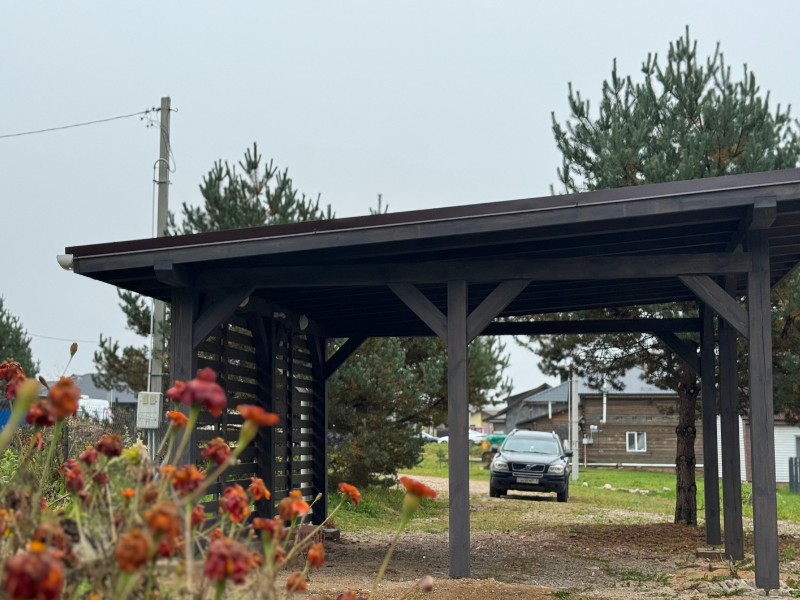 Фундамент: Бурозаливной — обеспечивает устойчивость на разных типах грунта. Каркас: Брус 150х150 мм — мощная основа, гарантия устойчивости всей конструкции. Стропильная система: Доска 150х50/150х150 мм — прочный каркас крыши, легко выдерживающий снеговую нагрузку. Кровля: Металлочерепица — современный, долговечный и стильный материал. Водосточная система: ПВХ 135 мм — отводит воду, защищая территорию вокруг навеса от луж и размывания. Ограждение: Доска 100х25 мм — обеспечивает боковую защиту от непогоды и придает законченный вид.