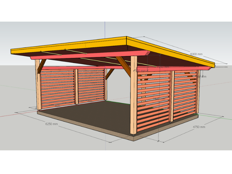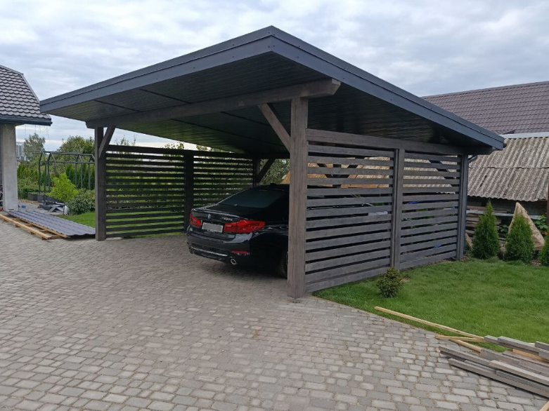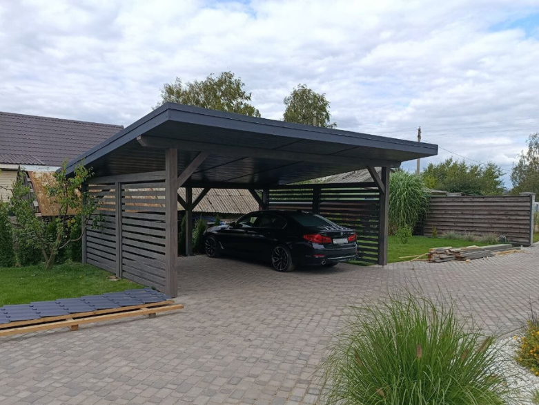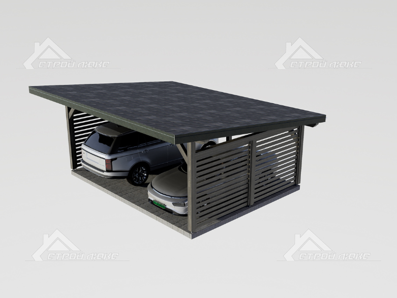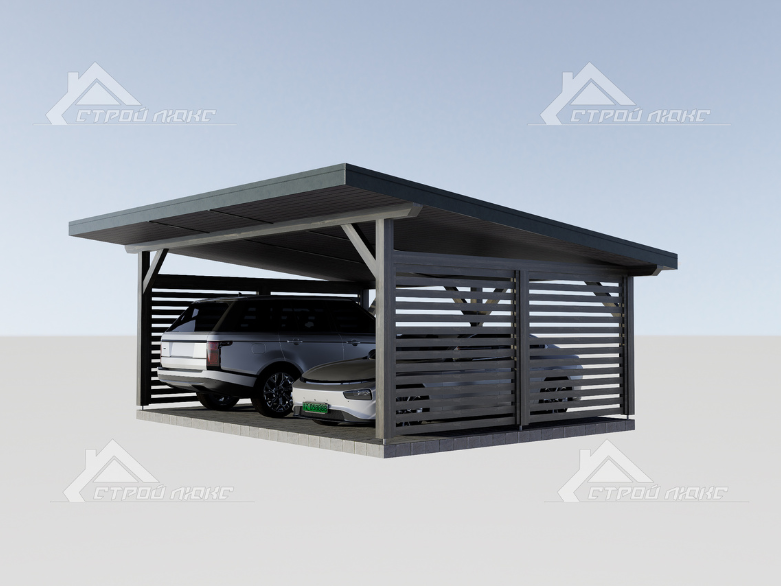 Теперь ваши оба автомобиля под надежной защитой! Просторный автонавес площадью 27,5 м² создан для комфортной парковки двух авто. Мощный брусовый каркас 150х150/200х150 мм и бурозаливной фундамент гарантируют устойчивость даже в непогоду. Металлочерепица надолго сохранит идеальный вид, а аккуратный софит и водосточная система ПВХ придают конструкции законченный внешний облик.